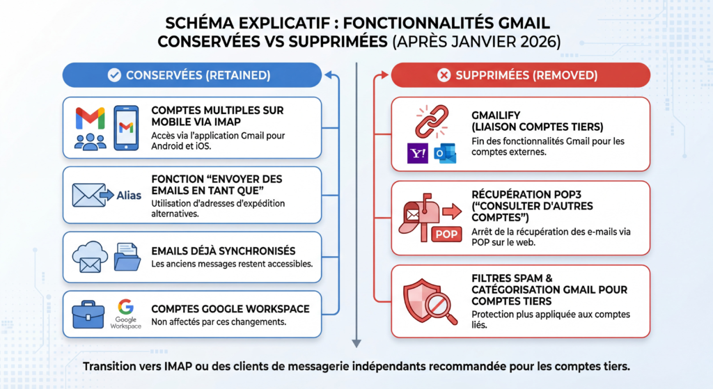 Concrètement, si vous avez configuré Gmail pour recevoir automatiquement les messages de votre adresse professionnelle ou personnelle hébergée ailleurs, cette synchronisation s’arrêtera net. Les emails déjà importés resteront accessibles, mais aucun nouveau message ne sera récupéré après la date butoir.